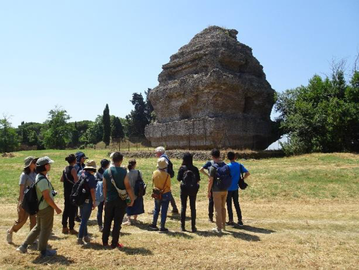 第一週的课程主要是考古学家Dr. Jan Gadeyne带领大家认识古罗马,Jan用浅显的英文讲解,相信大部份的同学都可以听懂。系上老师也同时介绍从古罗马到现在一直有人居住的「战神之地」,帮助同学了解Jan的课。一週下来介绍了古罗马人们居住的环境、罗马帝国全盛期的建筑、衰退的中世纪住宅以及中世纪晚期重建的都市,Jan也带领大家到郊外看古罗马的水道,了解水道的引水入城、加建与维修以及废弃后的重新利用,同时也让大家认识一个二世纪的豪华别墅,并参观罗马古道Via Appia旁像是太空船的超大坟墓,主人为了让人知道他是谁而建此特别的墓,但讽刺的是二千年来所有装饰掉落后,没有人认得这是谁的墓。最后Jan也带大家认识罗马如何从一个敬拜万神的城市,转变成敬拜独一真神的基督教城市。