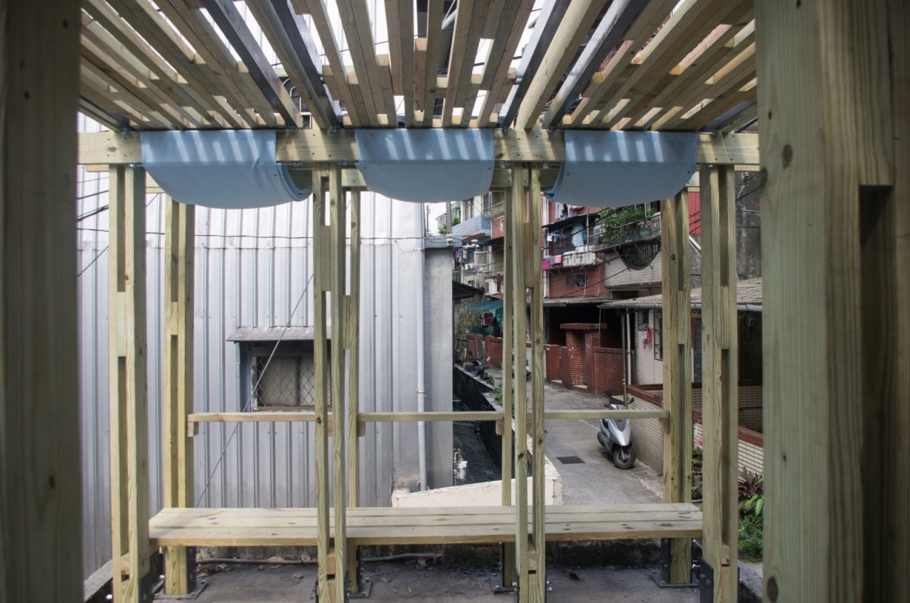 概念為模糊屋頂與牆的建築構造創造出可翻開、收闔的機構。根據不同時節的物理環境轉換可以遮陽的屋頂或是擋風的牆面。屋頂翻開之時亦像是船舶出航時的揚帆,在中山一路113巷串聯由山海工作營創造的物件成為一個端 點。也是一個視覺的引導並且為活動產生時的標的。