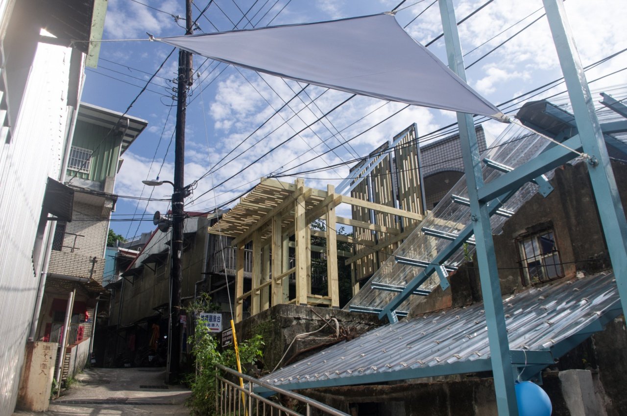 概念為模糊屋頂與牆的建築構造創造出可翻開、收闔的機構。根據不同時節的物理環境轉換可以遮陽的屋頂或是擋風的牆面。屋頂翻開之時亦像是船舶出航時的揚帆,在中山一路113巷串聯由山海工作營創造的物件成為一個端 點。也是一個視覺的引導並且為活動產生時的標的。