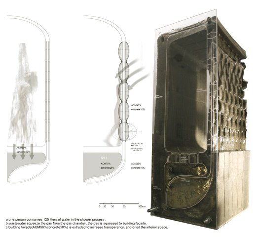 將此三項技術結合作為構築系統的控制因素,建築能藉材料把建築元素整合於一體中。以往僅限於開與關的門、窗系統以及垂直水平的建築結構,便能成為一體的迴路,在此前提下,建築內部將留設一定的氣室(除放氣體的空間),藉由環境的變動接收外部所產生的突發性狀況,壓力,投以特定的反饋方式。