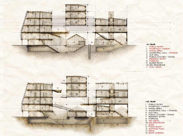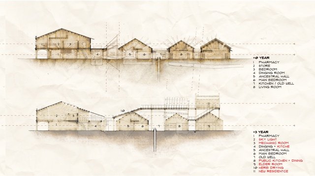 我試圖利用老房子的改建,作為修復家族關係的契機。從中醫的觀念裡思考建築,認為建築像人一樣是自然的一部分,有誕生與死亡。依循中醫的概念,安排老房子的死亡,引導新的建築誕生。在老房子死去與新房子成長過程中,家族循序漸進的緊密結合在一起。