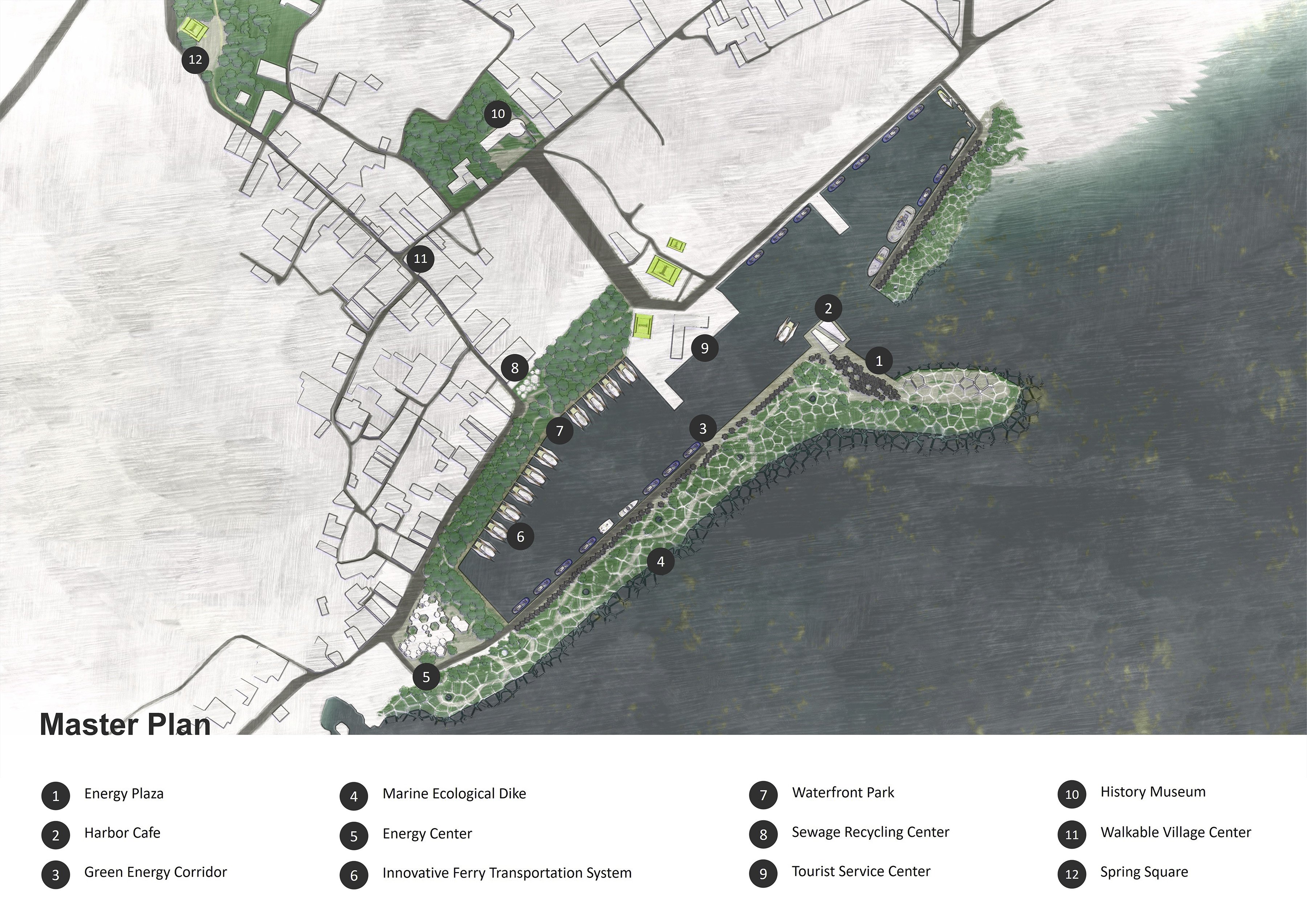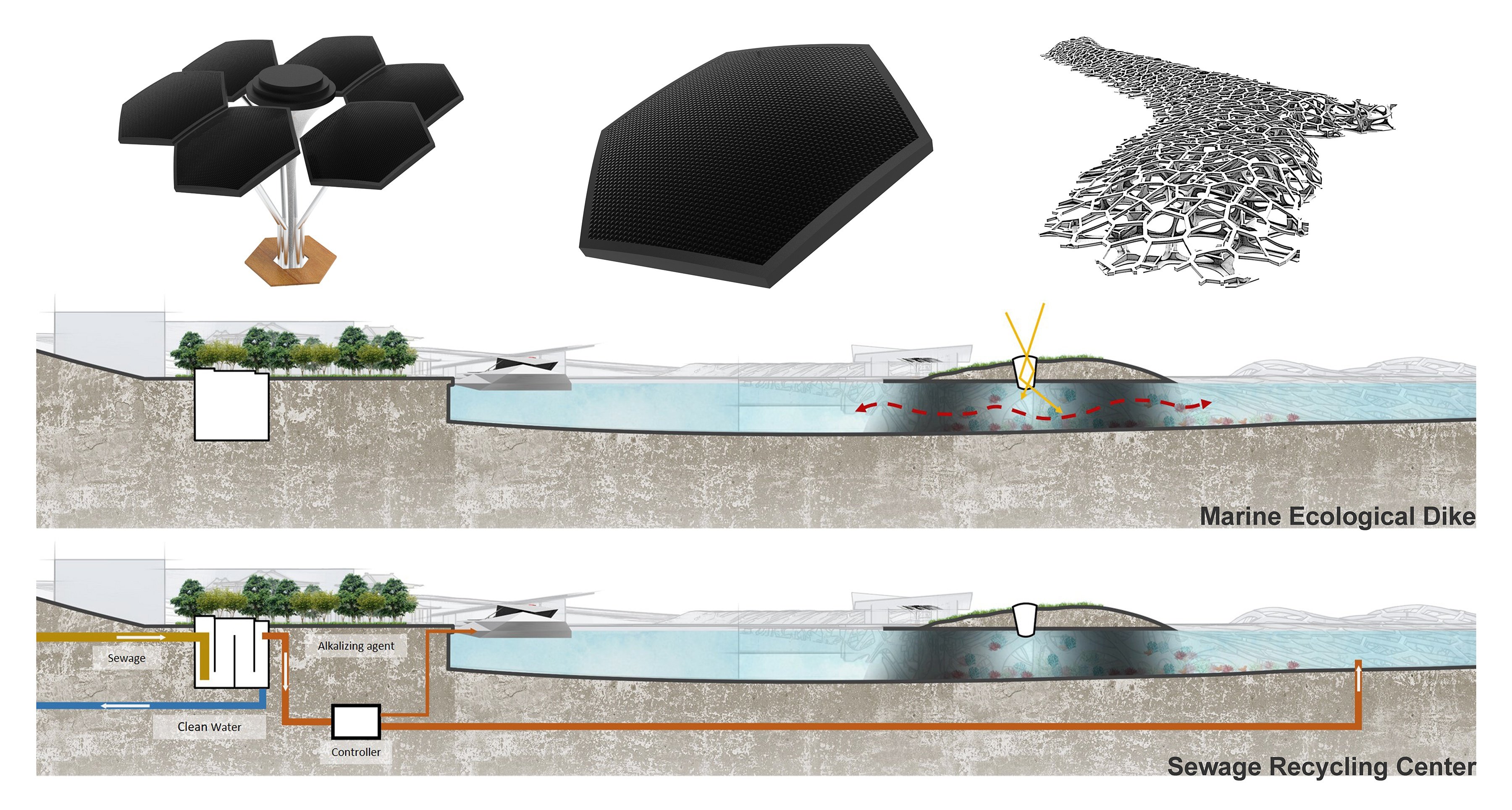 最後,以都市設計整合以上設計,使之能與居民互動。利用綠帶延伸到周圍環境,以確保空間可供所有人使用。 堤壩緩緩延伸入海,恢復了原來的海岸形態,使居民更容易接觸到水。小琉球通過整合Innovative Ferry Transportation System來改善海洋變暖和酸化的影響,同時為所有人創造高質量的生態環境。海洋生態堤則重新連接人與海洋的關係,賦予小琉球獨特的觀光模式,進一步為人類世的海洋活動和未來可持續發展提供設計想像。