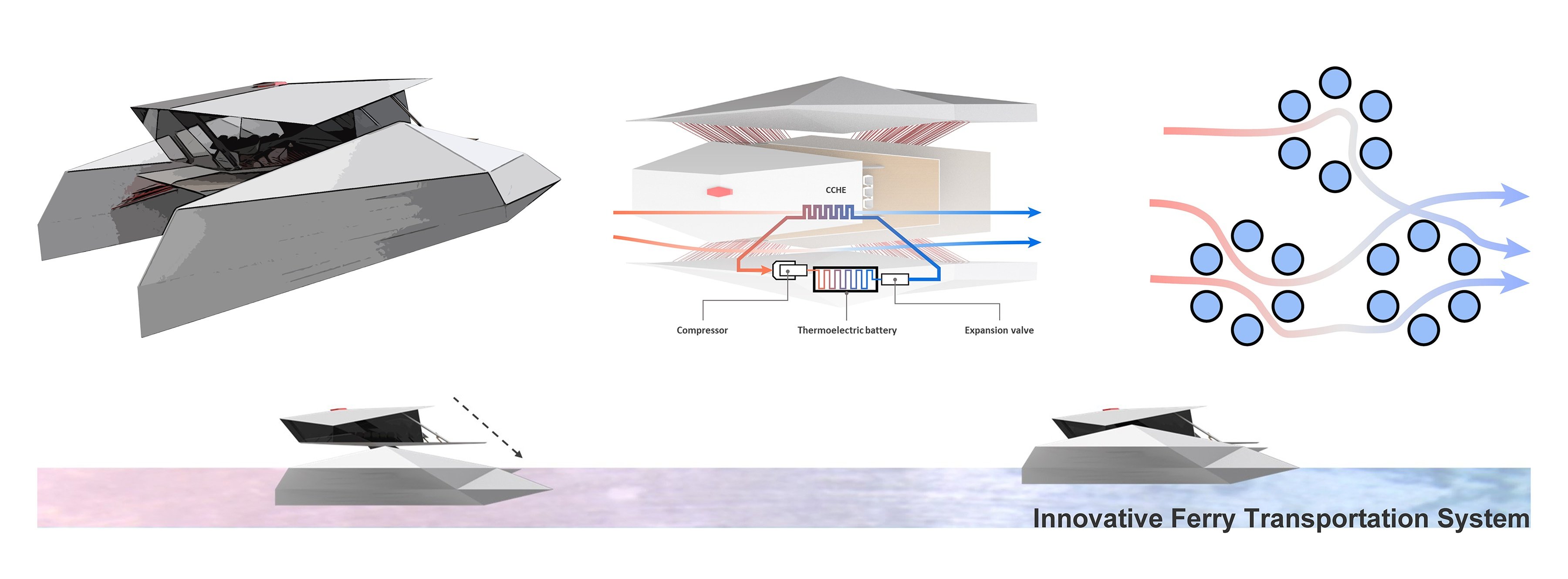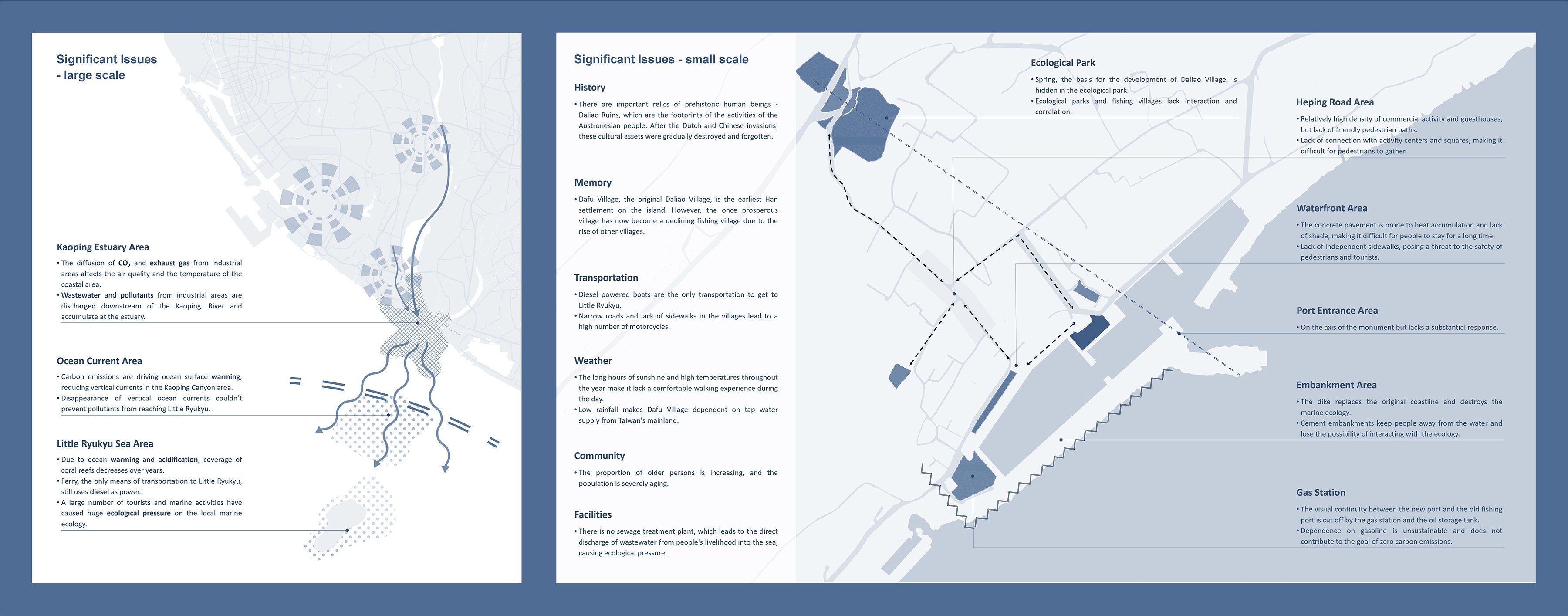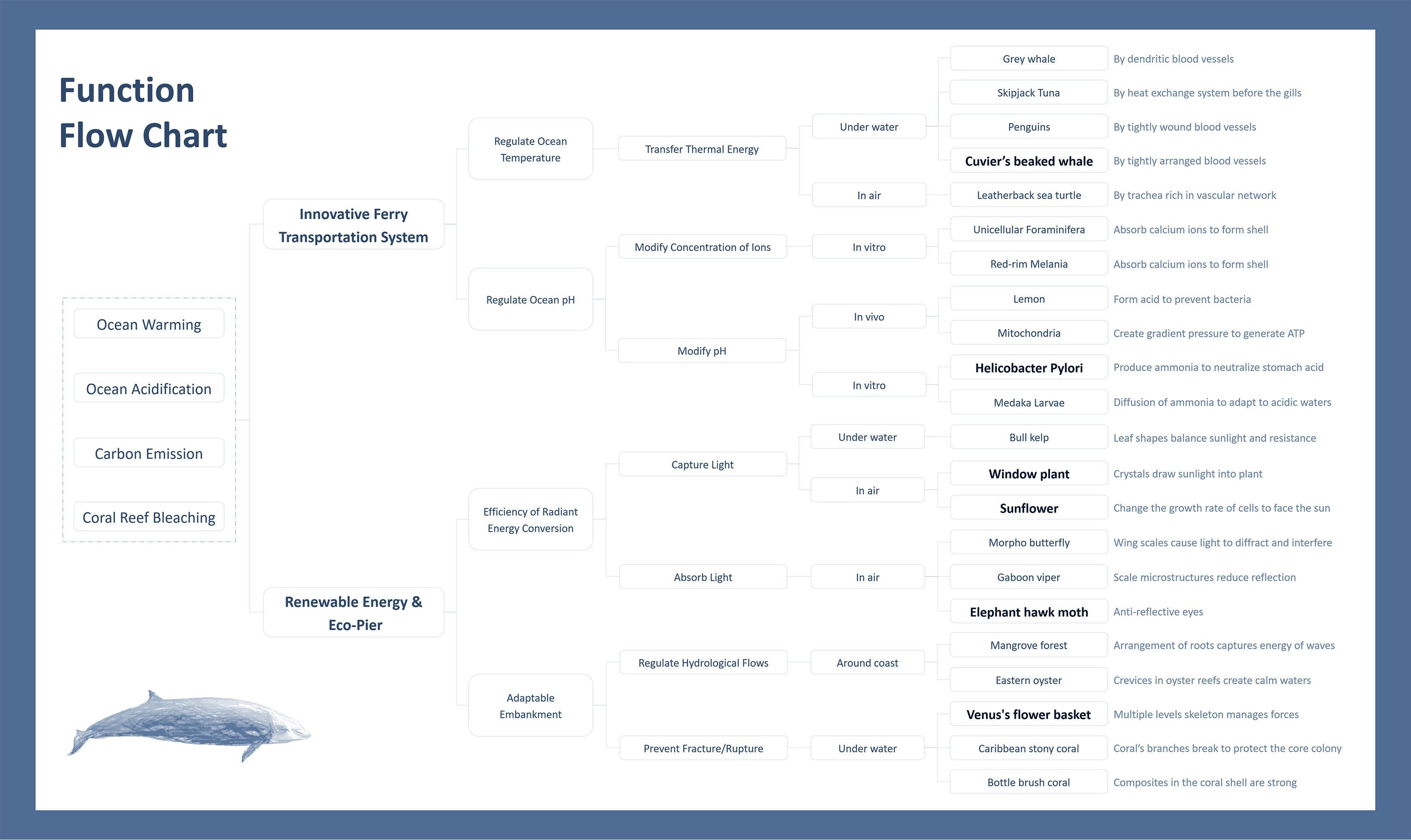 本研究針對小琉球周圍的洋流系統,分析海洋暖化和酸化的影響及改善現狀的機會。利用仿生方法,從Cuvier’s Beaked Whale中萃取了能夠回收熱能的結構,並轉化為新型渡輪設計,以冷卻海洋表面。Venus’ Flower Basket的結構被轉換為新型的海港堤壩設計,保持了生態活動的空間。幽門螺桿菌產生氨氣則成為靈感,使大福漁港不僅可以改善水資源的利用,還可以緩解小琉球的海洋酸化議題。