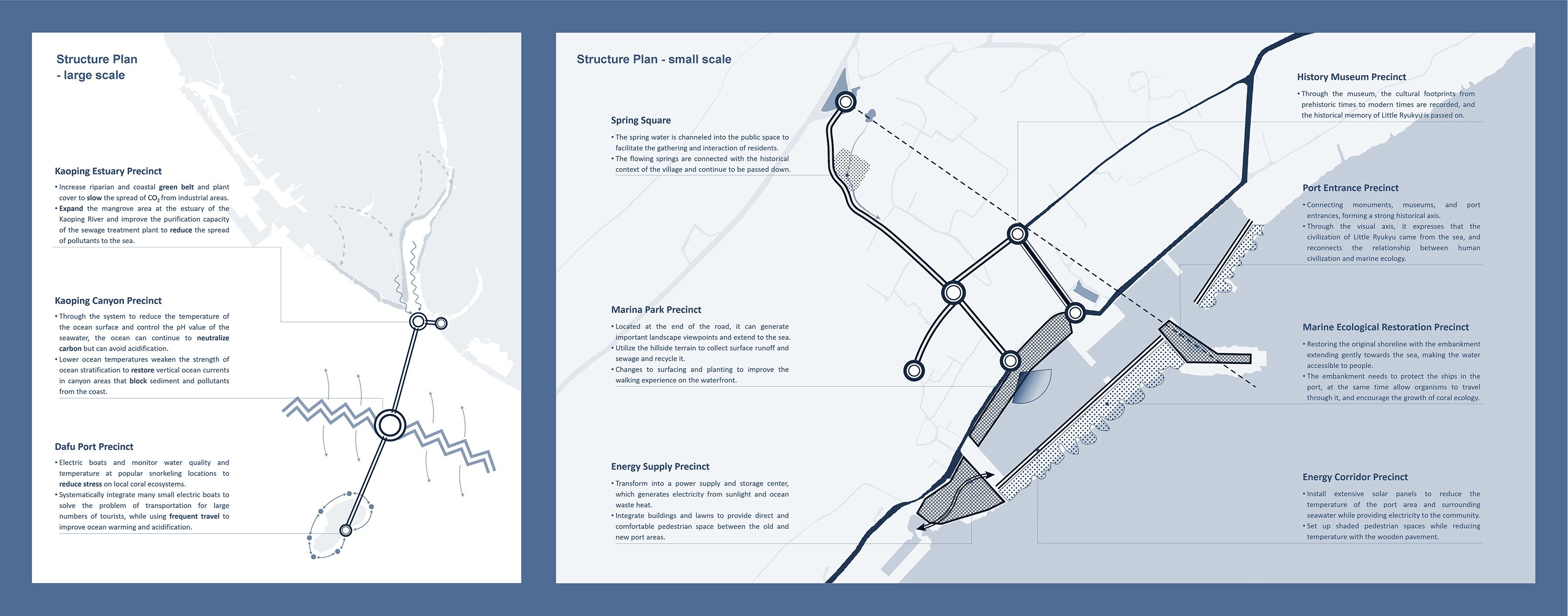 This study focuses on the current system around Little Ryukyu, and analyzed the impact of ocean warming and acidification and the opportunities to improve the current situation. Using Biomimicry methods, a structure capable of recovering heat energy, extracted from Cuvier’s Beaked Whale, is transformed into a new type of ferry, which can cool the ocean surface. The structure of the Venus’ Flower Basket is transformed into a new type of harbor dike which maintains the space for ecology. Helicobacter Pylori's action to generate ammonia became the inspiration, enabling Dafu Port not only to improve the use of water resources but also to alleviate the problem of ocean acidification in Little Ryukyu.