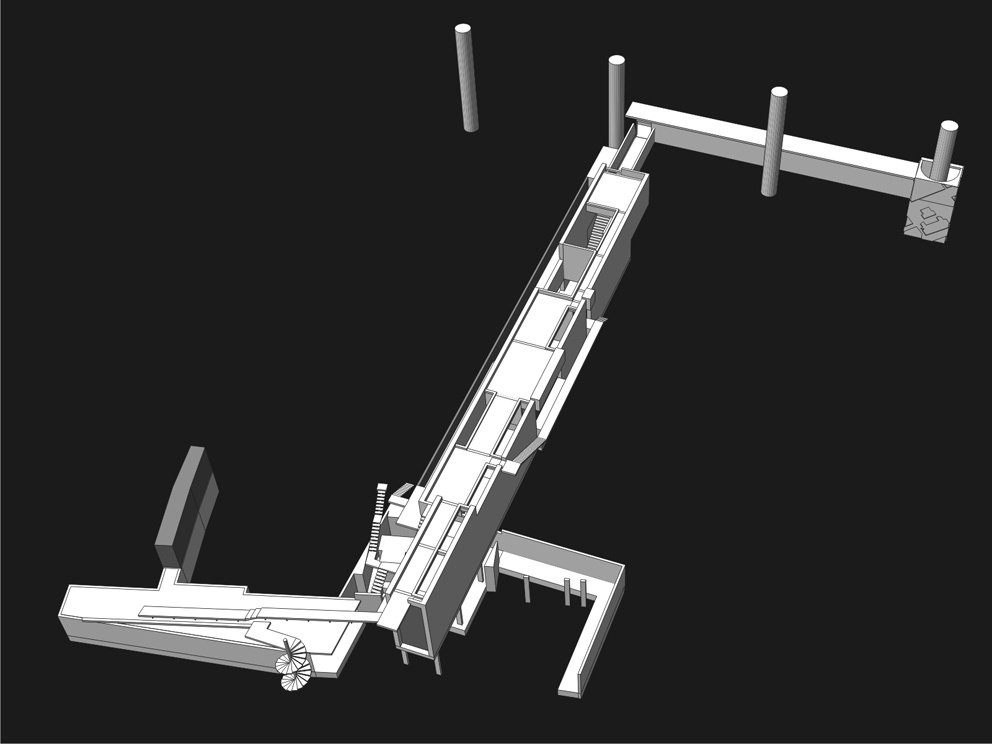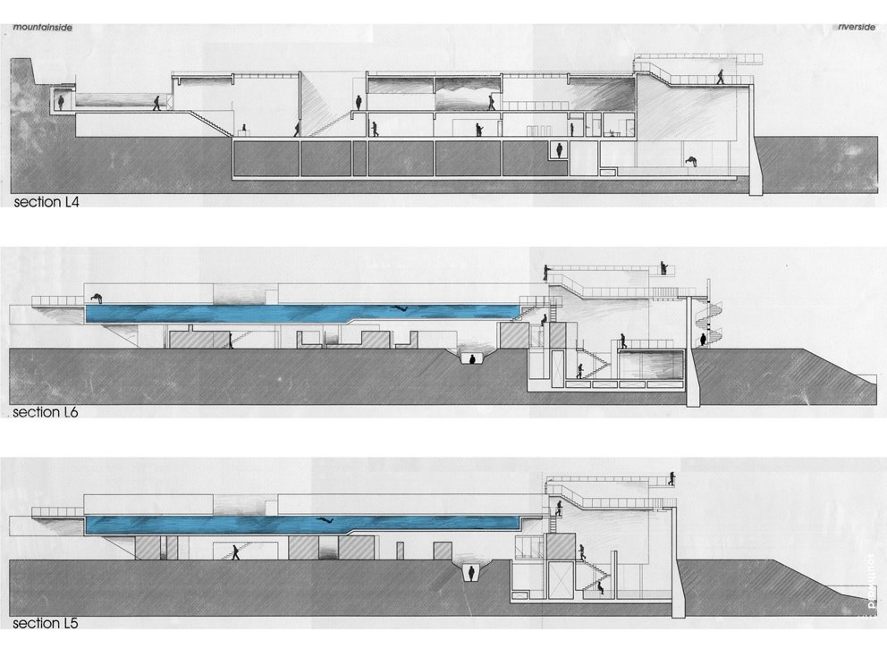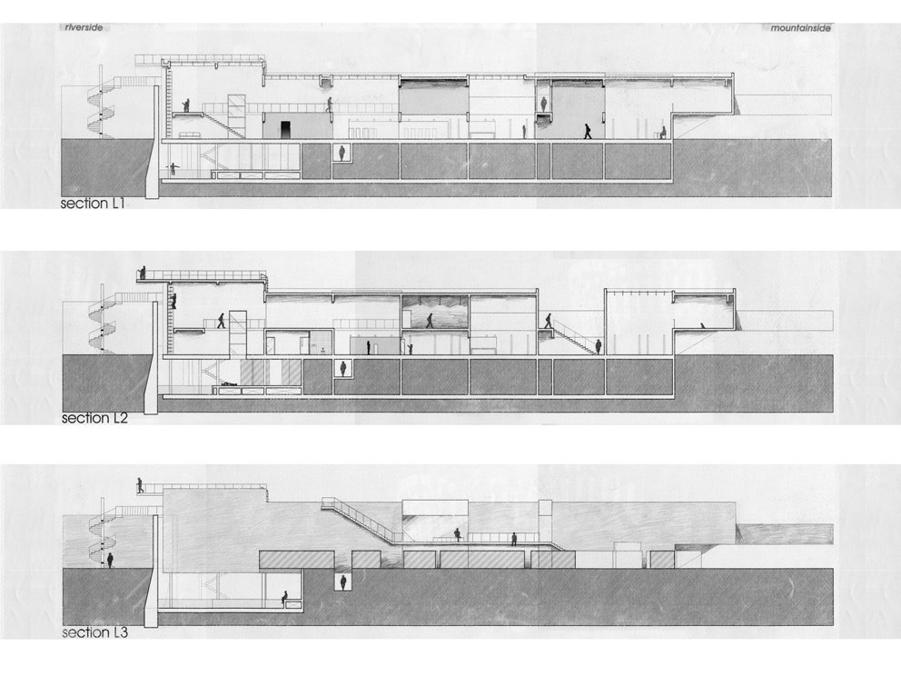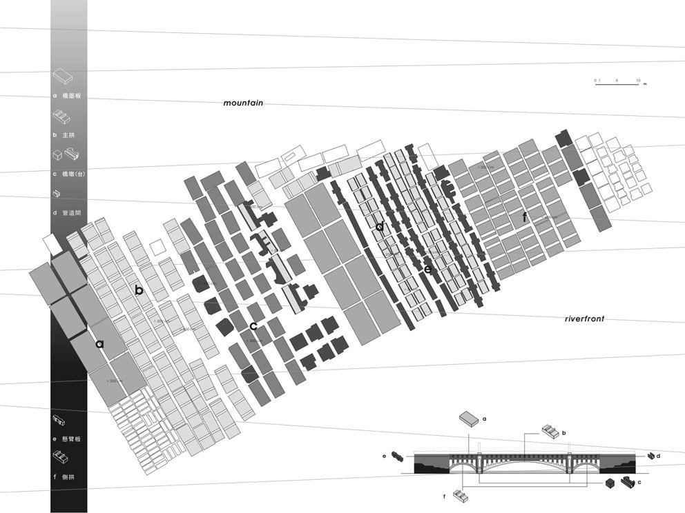 1/1 中山橋拆解了,散落再春游泳池原址上。殘骸受制於載具,橋,已然消逝。為了重新組回中山橋,殘骸留在消失的水岸邊。然而,能夠不代表必然該如此而為,設計就建立在這已然發生的斷裂上。 新介入的設計裡,一條橋的”裡面”而不是上面,展示著人們留下來卻不願再提起的事物。在此,人們經歷河岸剖面,穿越水泥塊與一座泳池水道卻無法真實的觸摸,直到巨大的水泥塊躍入通道的另一端為止。橋,連接的不是堤坊的內與外,而是極端的尺度變化與人們不願面對的過去與現實。